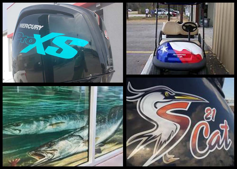 Waypoint Customs offers in-house vinyl graphic designs and installation. From TX numbers to full body wraps, we can be your one stop shop to personalize your boat or cart. Extensive examples are on display or you can sit down with our graphics designers to customize your job.